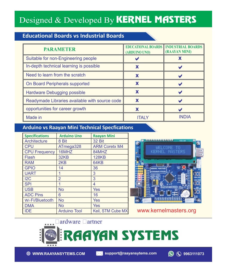 Arduino is an educational prototyping platform. Raayan Mini is an industrial training board.